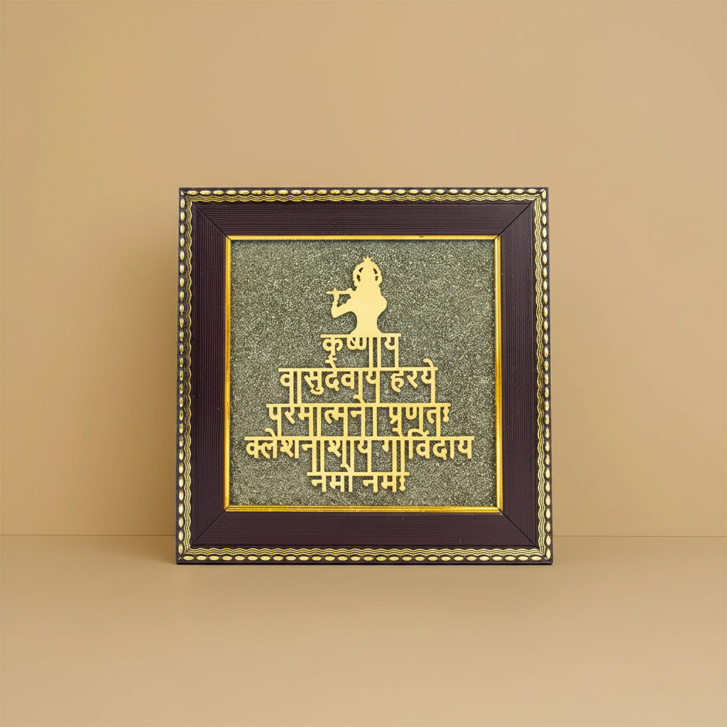 “Krishnaya Vasudevay” Ek Pavitra Mantra Hai Jo Shanti, Protection Aur Divine Guidance Ka Prateek Mana Jata Hai. Is Beautiful Krishnaya Vasudevay On Raw Pyrite Frame Ke Saath Aap Apne Ghar Ya Office Me Bhakti Ke Saath Wealth Energy Bhi Invite Kar Sakte Hain.